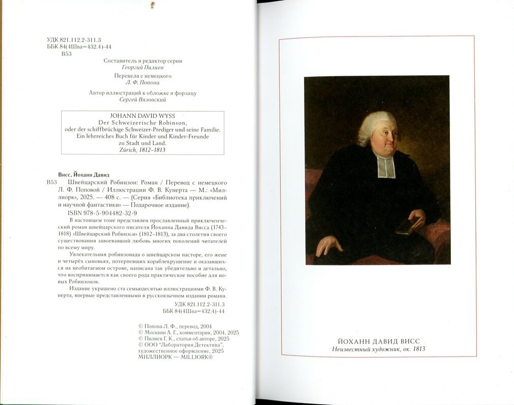 В новом томе серии БПНФ (Подарочное издание) представлен прославленный приключенческий роман швейцарского писателя Йоханна Давида Висса (1743–1818) «Швейцарский Робинзон» (1812–1813), за два столетия своего существования завоевавший любовь многих поколений читателей по всему миру.